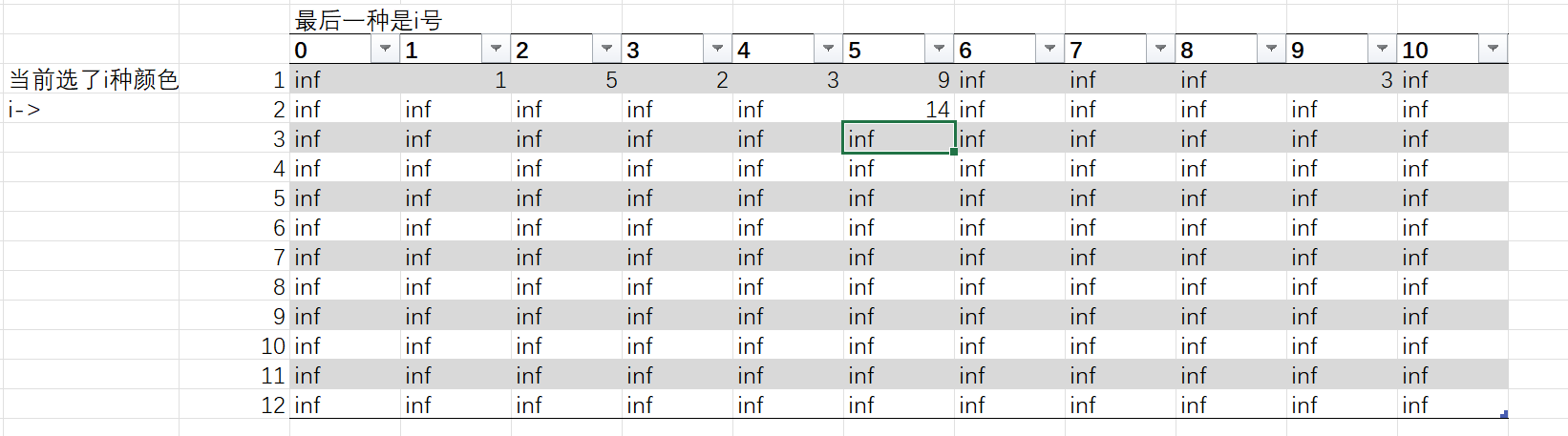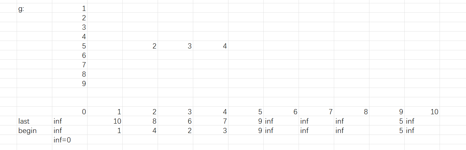 接下来记录遍历每个颜色(对于每个颜色i) ,看看有哪些颜色(即j)在原数组中的位置是完全在他前面的,即 j 颜色的last小于 i 颜色的begin,(并且j<i由循环条件可知默认成立)。如果有的话加入到数组g的第 i 项指向的(可以这么理解)数组中去。表示在取 i 颜色时候,可以取 j 颜色作为他的前驱