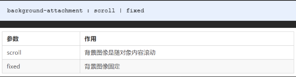 background-attachment 属性设置背景图像是否固定或者随着页面的其余部分滚动。