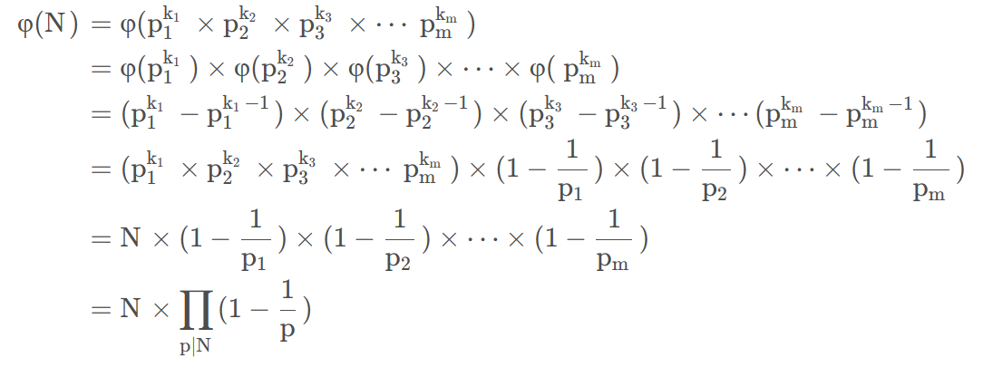 φ ( N ) = N × ∏ p ∣ N ( 1 − 1 p ) \varphi(N)=N \times \prod_{p\mid N}(1-\frac{1}{p})