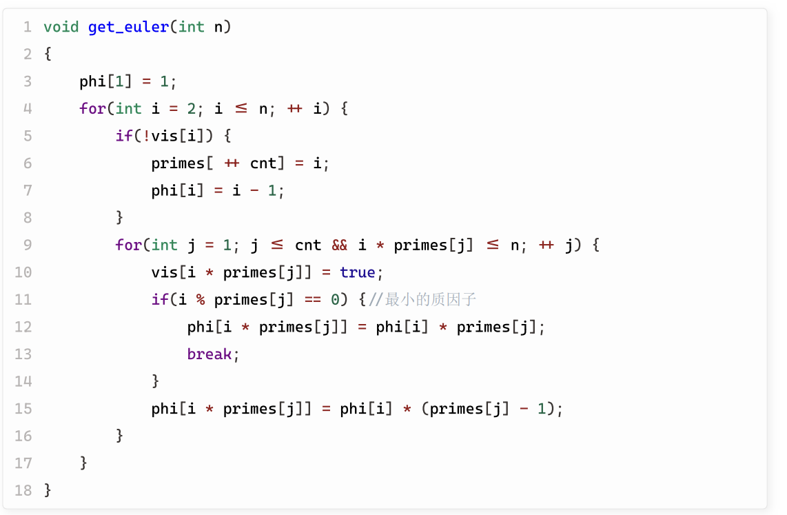 1 2 3 4 5 6 7 8 9 10 11 12 inline int euler_one (int n) { int ans = n; for (int i = 2 ; i * i <= n; ++ i){ if (n % i == 0 ){ ans = ans / i * (i - 1 ); while (n % i == 0 )n /= i; } } if (n > 1 )ans = ans / n * (n - 1 ); return ans; }