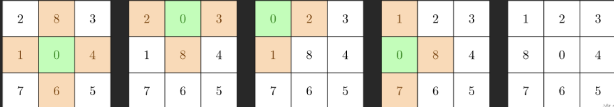 图中标有 00 的是空格。绿色格子是空格所在位置,橙色格子是下一步可以移动到空格的位置。如图所示,用四步可以达到目标状态。