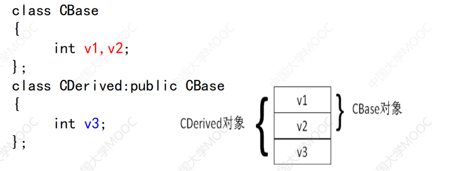 派生类对象的体积,等于基类对象的体积,再加上派生类对象自己的成员变量的体积。在派生类对象中,包含着基类对象,而且基类对象的存储位置位于派生类对象新增的成员变量之前 。