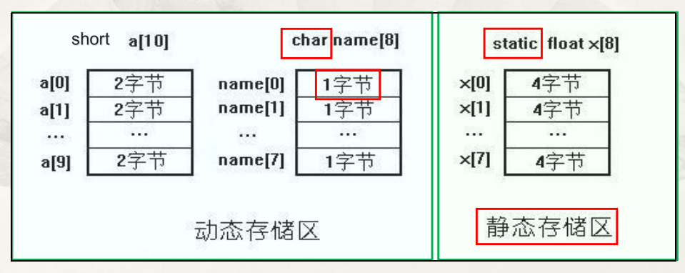 • 根据数组的数据类型,为每一元素安排相应字节数的存储单元
