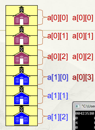 • a[0][3]和a[1][0]指的是同一元素,不检查下标越界,a[0][3]的写法也合法,但隐患严重