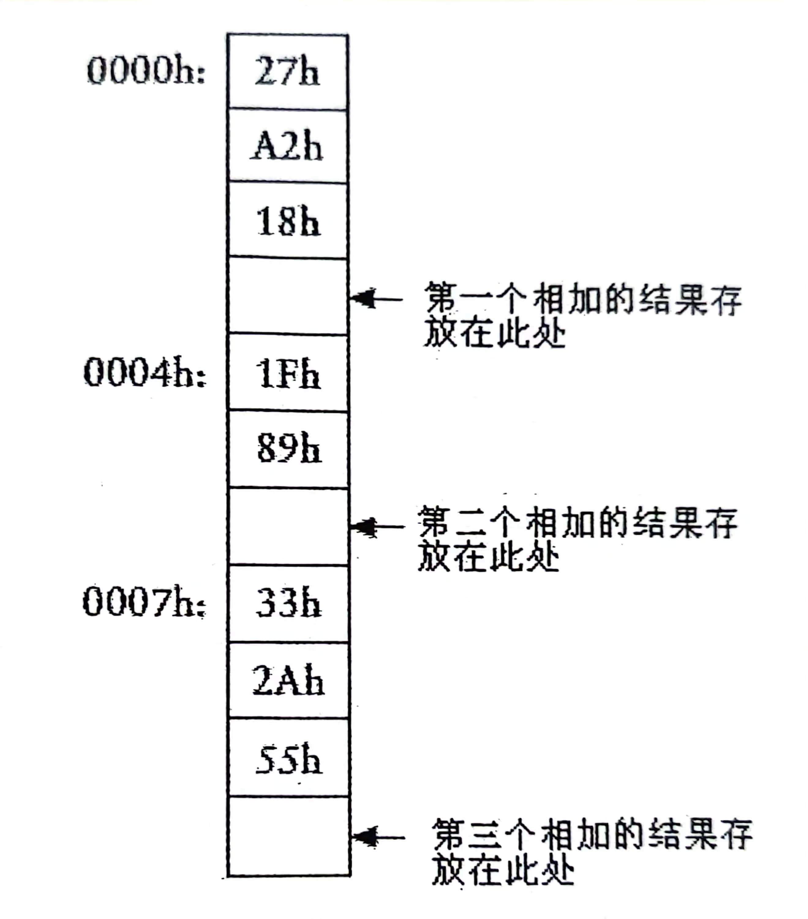 当计数器输出0002h时,RAM将0002h位置的数据18h输出到加法器的A输入端,并且执行求和操作,得到的结果E1h同样的沿右边路径回到B端口并保持。