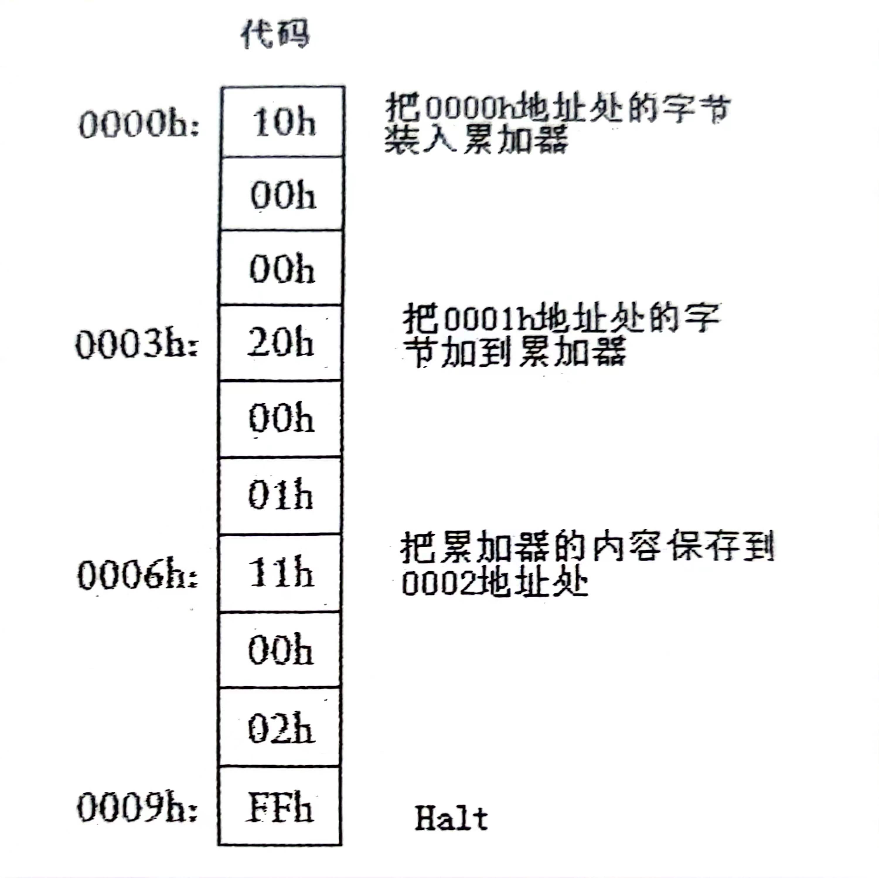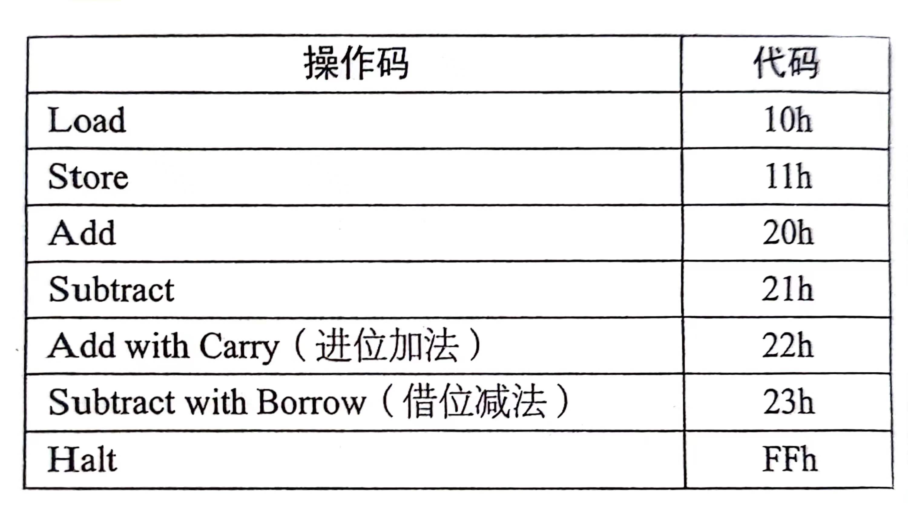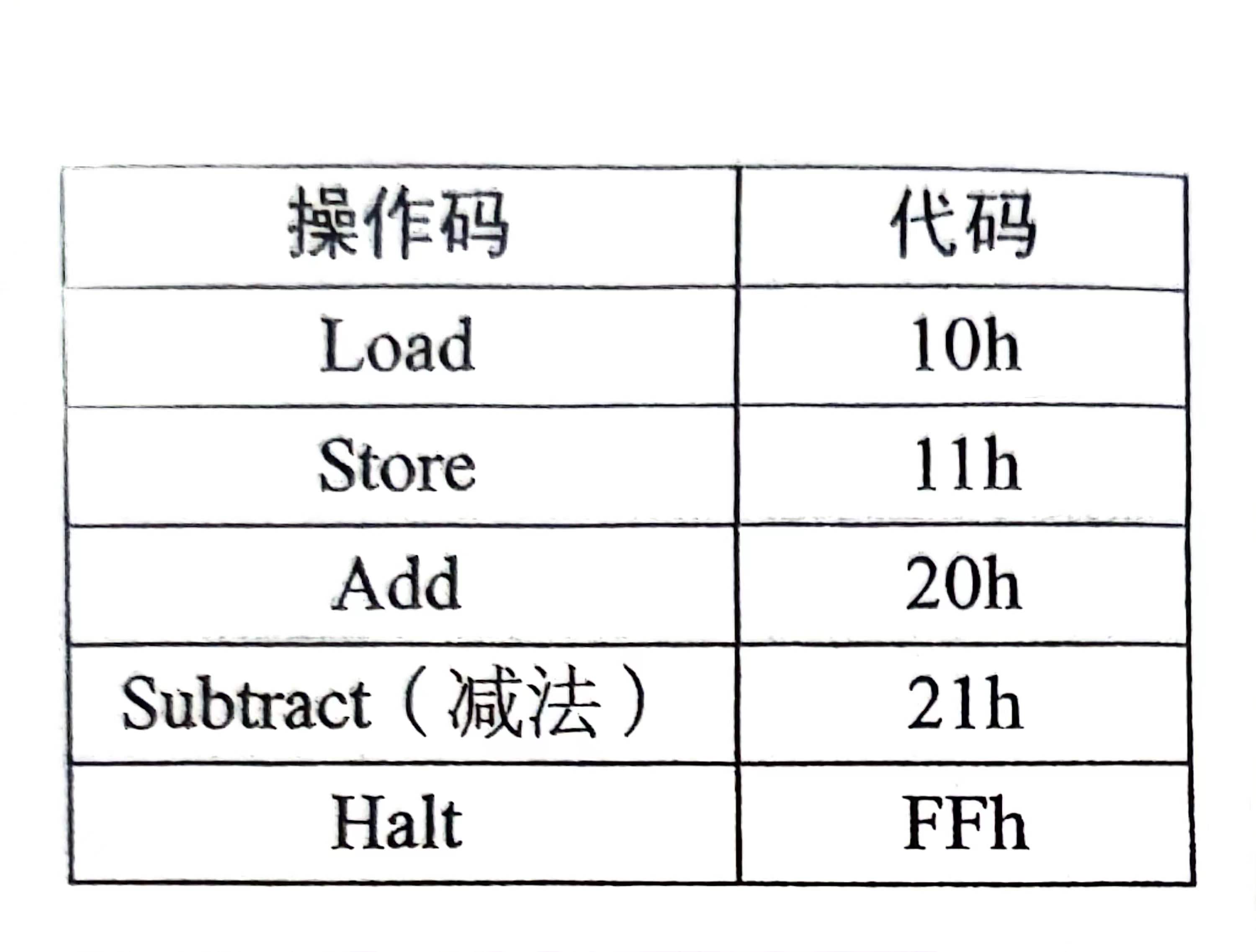 由上述例子可以看出,进行连加操作的时候,首先要把一个字节从存储器传输到累加器中,这个过程称为加载(Load),再要把一个字节从存储器中加(Add)到累加器中。第三个操作是把累加器运算结果保存(Store)回数据RAM中,另外还需要让累加器停下(Halt)的操作。有可能我们后面还需要减法(Subtract)。