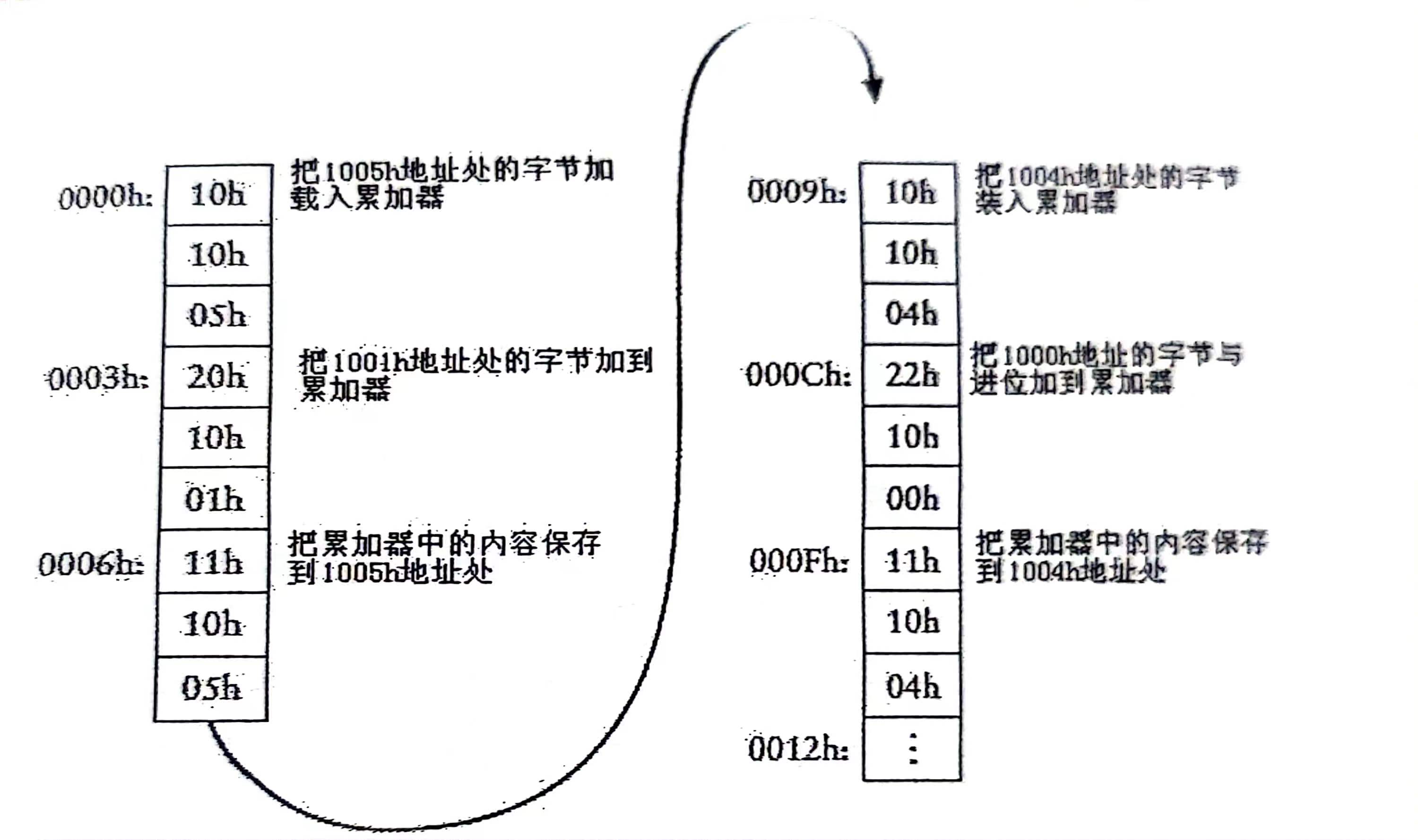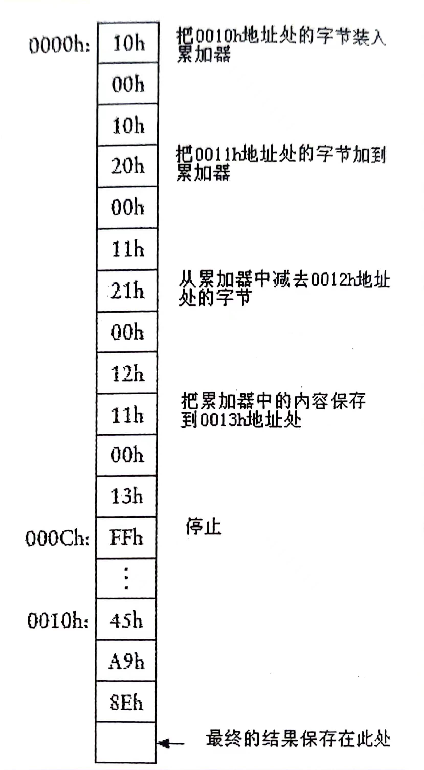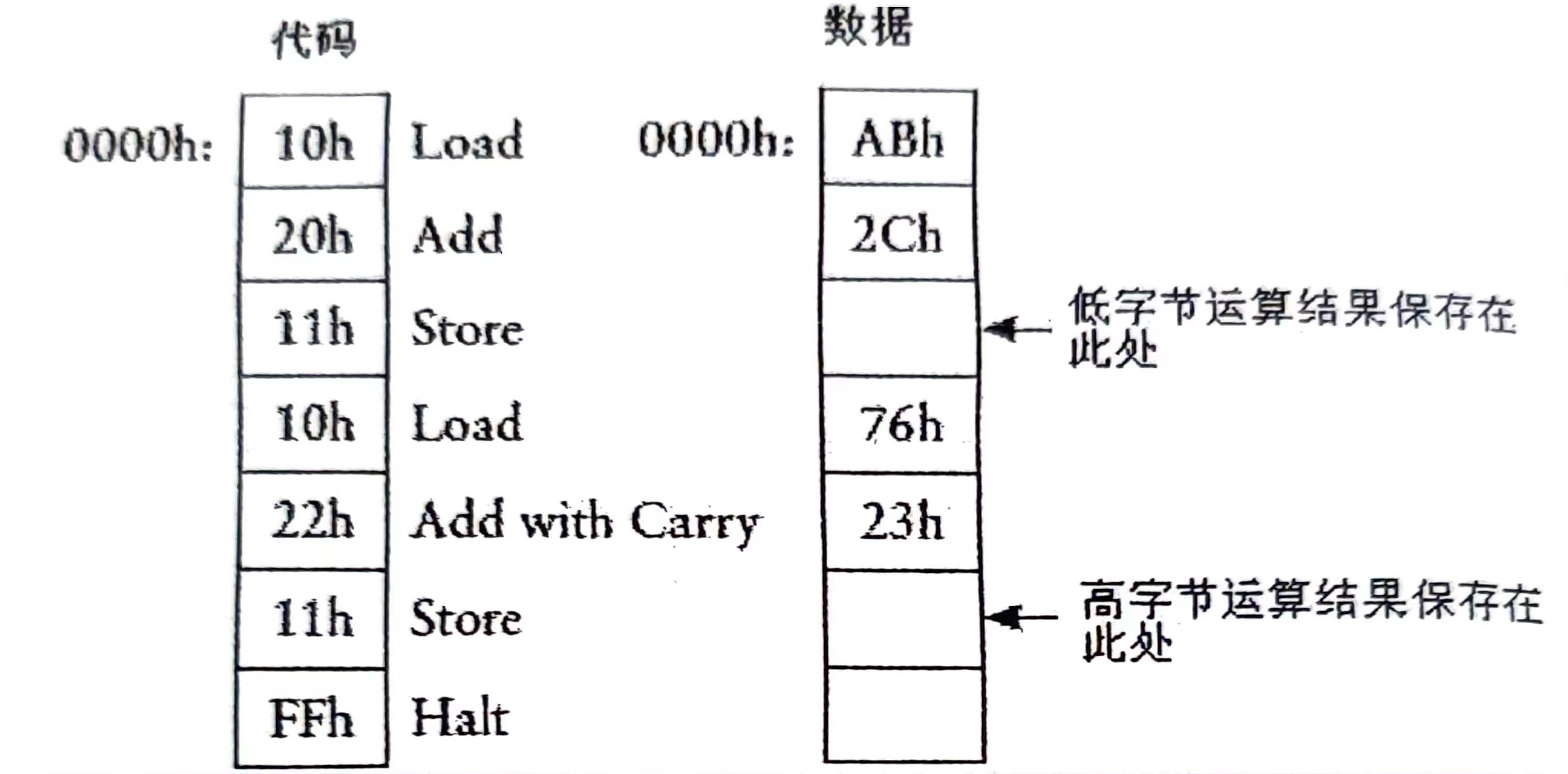 由上述例子可以看出,进行连加操作的时候,首先要把一个字节从存储器传输到累加器中,这个过程称为加载(Load),再要把一个字节从存储器中加(Add)到累加器中。第三个操作是把累加器运算结果保存(Store)回数据RAM中,另外还需要让累加器停下(Halt)的操作。有可能我们后面还需要减法(Subtract)。