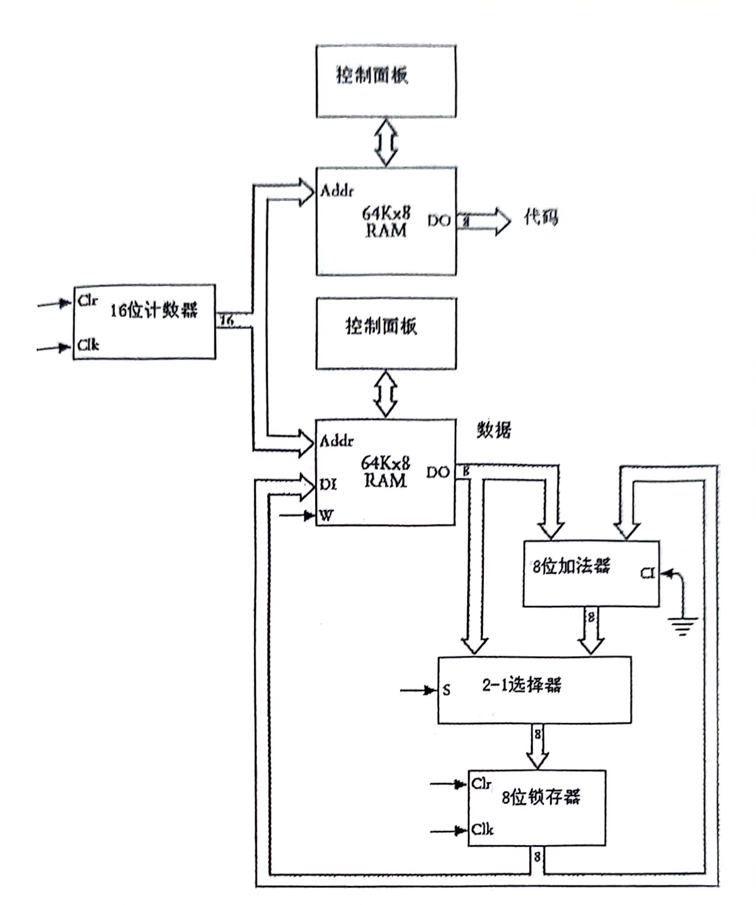 上图中使用了两个RAM阵列,一个用来存放指令码,另一个用来存放操作数据