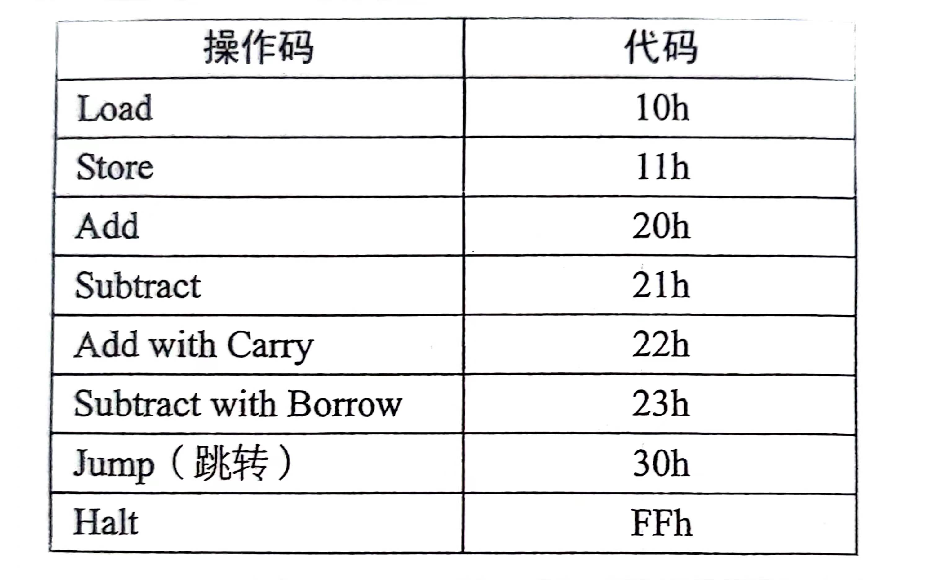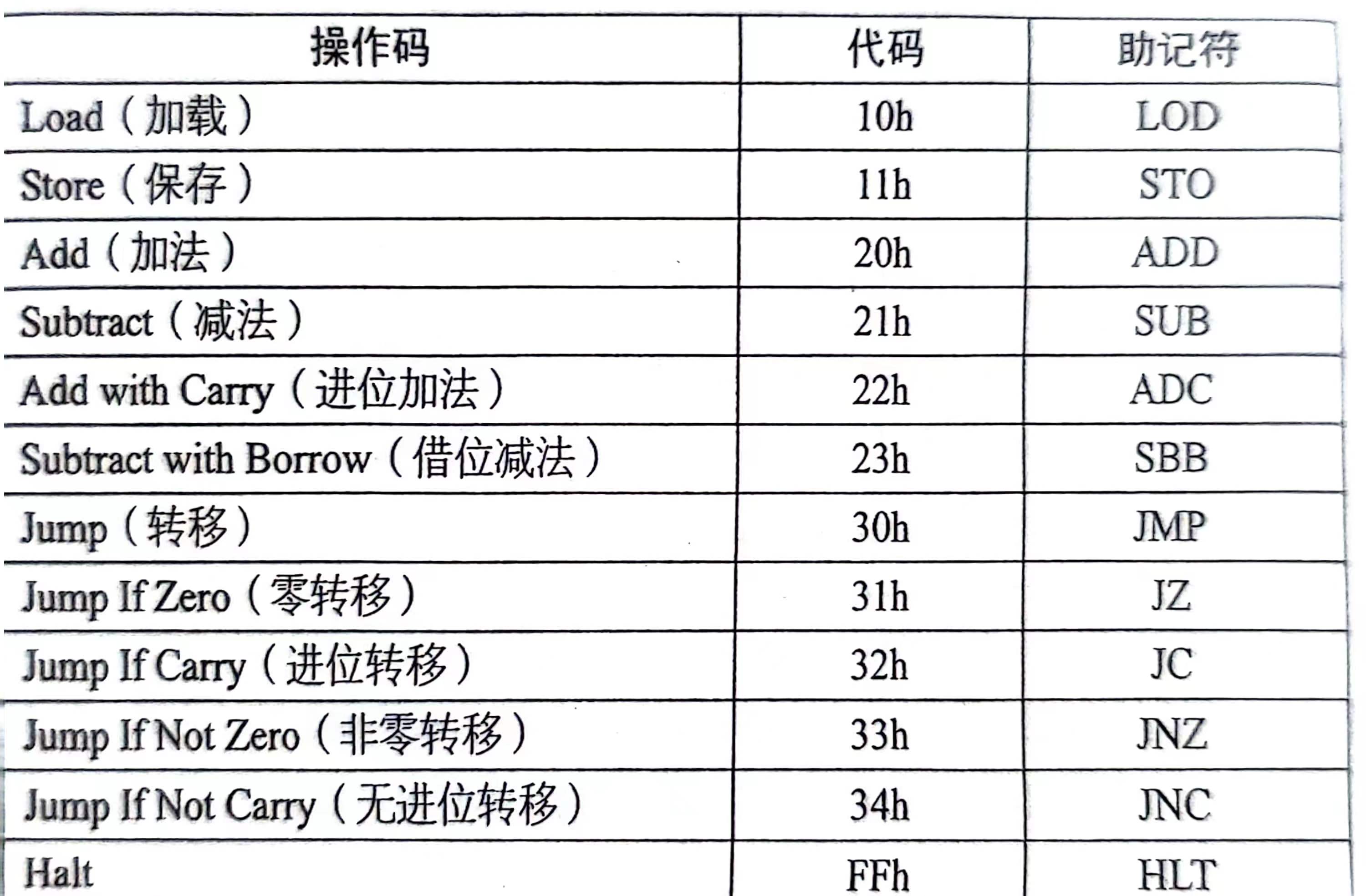 - 扩展寻址模式:除了停止指令(Halt指令)之外,需要3个字节,第一个字节记录操作内容,第2,3个字节记录操作对象的地址。