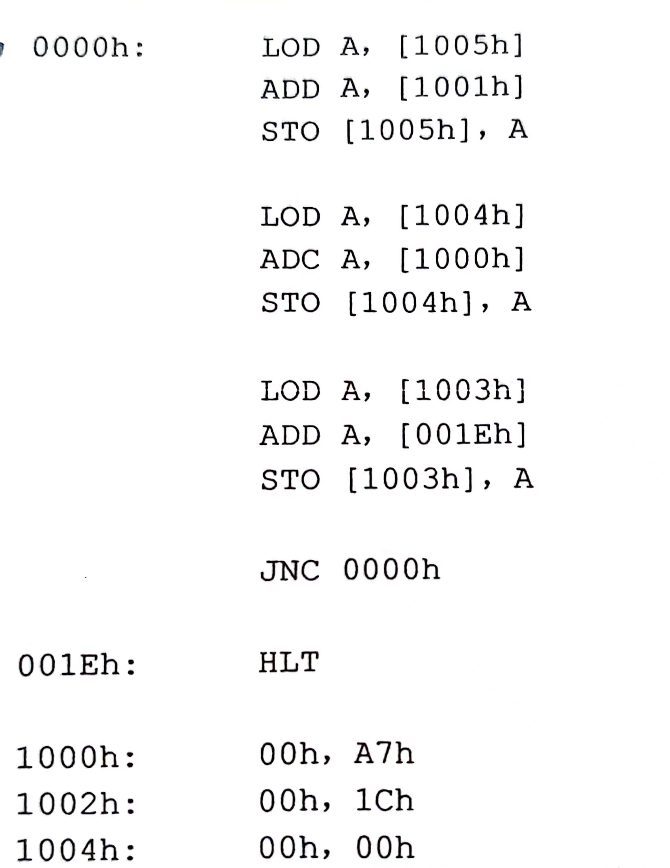 - 当执行到第28次循环的时候,1004h和1005h地址保存的16位数等于A7h和1Ch的乘积。1003h地址保存的值为1,此时他和FFh相加的值为0,因此0标志位被置位。Jump If Zero指令不会在跳转到0000h地址,相反,下一条执行的指令即Halt指令